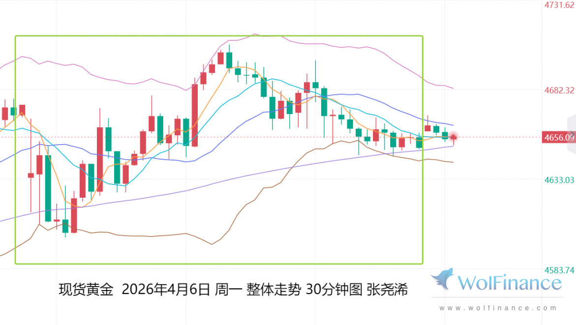 上交易日周一(4月6日):国际黄金震荡十字收跌,走势平淡,一方面受到上周五非农强势向好利空压力,和地缘局势升级推动油价走高令金价承压,另一方面,霍尔木兹海峡船只通行数量升至3月初以来最高水平,减弱了油价上涨动力,令其金价仍运行在10日均线上方,加上布林带处于缩口,市场对于地缘局势因素加剧和缓解都反应不大,暗示短期走势偏向横盘震荡为主。但反向上,个人仍看好上行。