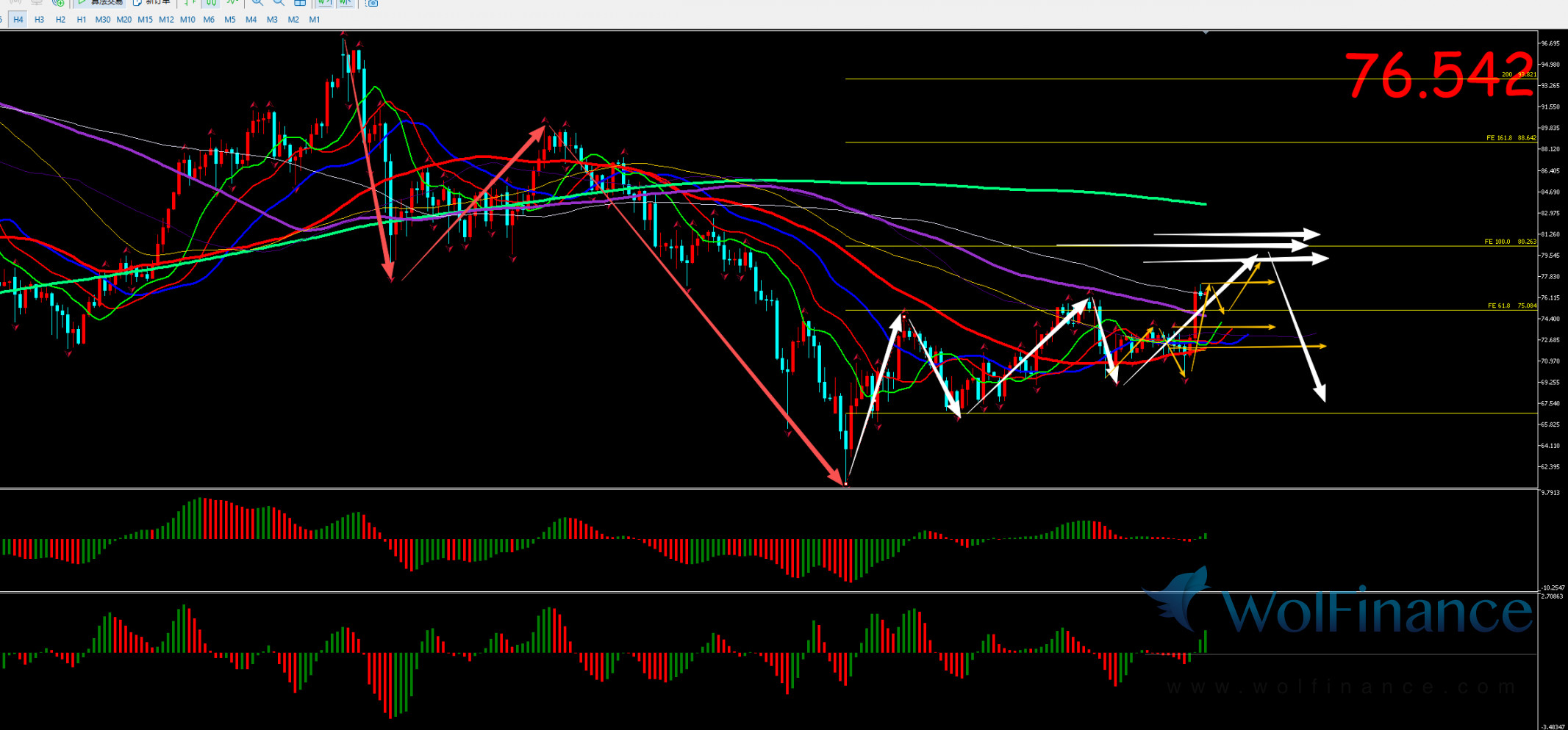 解析:日线AO绿色,AC红色;4小时AO红色,AC红色;银价自121.57下跌至日线的120均线至63.83此段下跌判定为日线的下跌A浪,银价自63.83反弹至96.34后为反弹B浪,银价自96.34下跌破了日线的120均线此段为下跌C浪预期,目前此段下跌在2小时上且具体走结构的周期是1小时是故最低标准反转线为1小时的89均线,银价跌至161.8-200对应的61.58-56.64区间后反弹,反弹至2小时的89均线附近后回落,2小时反弹进入了60和89均线由此判定1小时开启调整4浪预期,银价自60.87上涨至74.51判定为1的反弹4-a,银价回落至66.67判定开启了调整4-b预期。上周五银价跌至66.67后反弹至71.61后回落今日亚盘时段银价跌至67.67,银价延续在71.61-67.45之间震荡,银价上破71.61站上2小时的120和4小时的120均线1小时开启了4-C浪截止目前涨至75.53附近小幅回落,本轮上涨主波动周期为30分钟或1小时是故最低标准反转线为1小时的89均线和30分钟的120均线,银价涨至76.10后回落至4小时的60均线附近69.46后反弹至30分钟的60-89区间73.09,昨日银价在73.09-71.05之间震荡,形成2小时的混沌点且混沌先下破跌至69.79后收线回到2小时的120均线上方后上破了73.38上分型开启了2小时的5浪上涨,目前处于2小时的5-3浪中上方预期位置是77.83-79.37-80.18-81.80目标预期,当下银价涨至77.17后回落,日内关注10分钟的60-89-120均线的多空选择,若不跌破则继续看30分钟延续主升浪预期,若跌破则关注30分钟开启调整5-4及反转A-3浪预期。