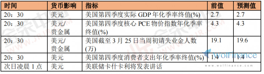 本交易日将出炉美国初请失业金人数变动和美国四季度GDP终值,市场预期跟前值变化不大,就业市场料维持强劲。更多的目光关注周五将出炉的美国2月PCE数据,这是美联储偏爱的通胀衡量指标。