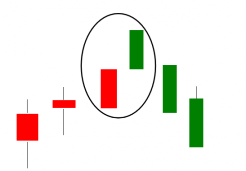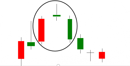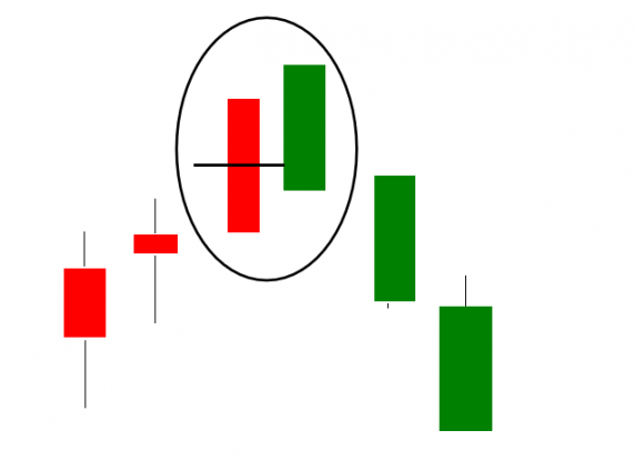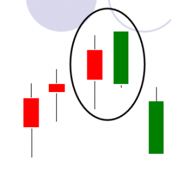 第二种是出现在下跌行情中,前一根为阴线,后一根为阳线,后者将前者实体完全包容在内(可不包括上下影线)。
