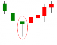 此图形在上升过程中出现是较为可靠的转势信号,上影线为实体的2倍以上,下影线没有。