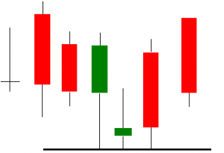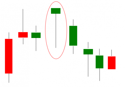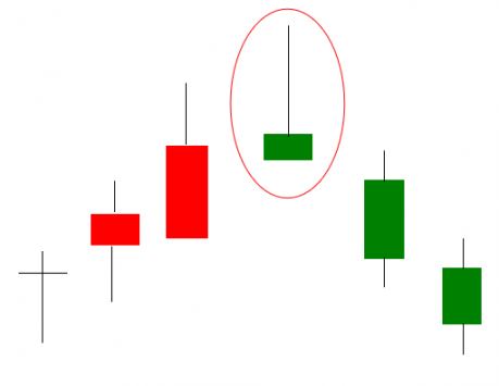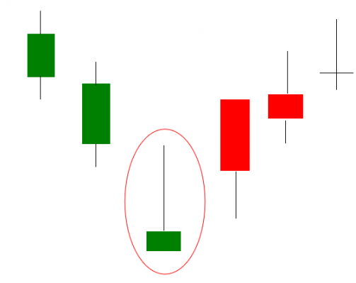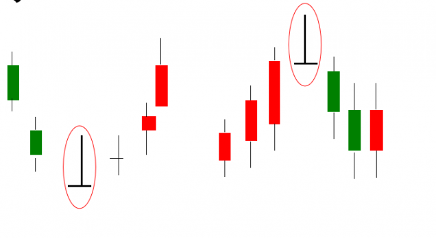 此图形在下跌过程中出现,是一种见底信号,上影线为实体的2倍以上,下影线没有。
