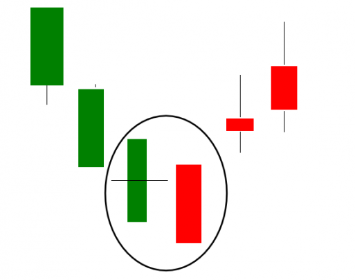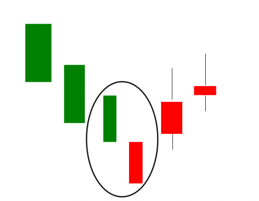 第一种是出现在上升行情中,前一根为阳线,后一根为阴线,后者将前者实体完全包容在内(可不包括上下影线)。