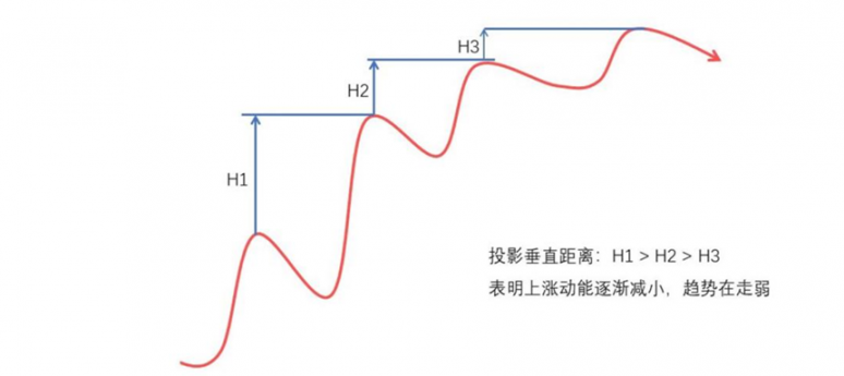 投影是指相邻波段高点(上涨结构趋势)或相邻波段低点(下跌结构趋势)的垂直距离。投影距离增大,表明趋势在增强,反之投影距离减小,趋势在减弱。