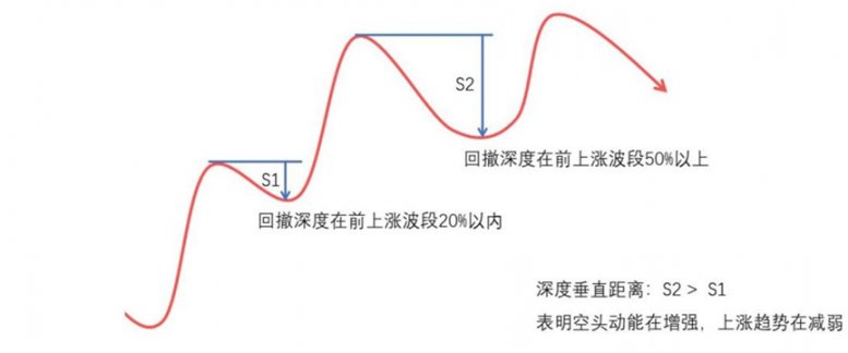 深度是指价格回撤的垂直距离。上涨结构趋势中,价格回调越深,表明多头趋势在减弱,空头动能在增强;下跌结构趋势中,价格反弹越高,表明空头趋势在减弱,多头动能在增强。