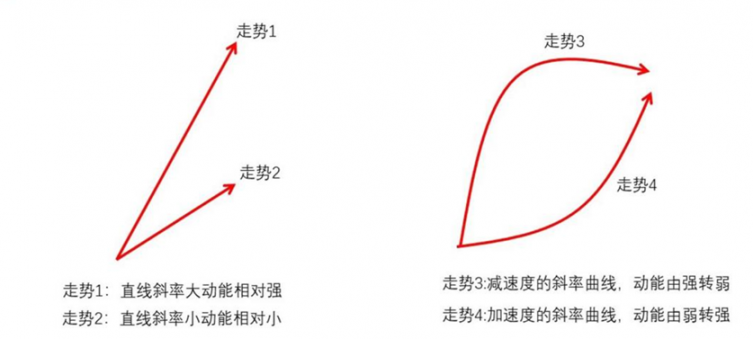 斜率指价格运动的角度。直线的斜率代表的是速度,同一时间单位内,斜率越大动能越强,反之斜率越小动能越小。曲线的斜率代表的是速率,即加速度和减速度。如果同一波段的价格运动角度由陡峭变缓慢,表明动能由强转弱,相反如果由缓慢变陡峭,表明动能由弱转强。