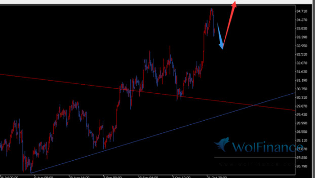 白银,走势比较理想,最高点接近中长期离场的位置35.5,目前出现调整,若充分调整后,依然可以再次入场,但仓位需再次控制,需更小仓介入; 短线笔者认为会出现向下的调整,若能在32.2-32.8附近止稳,可以考虑再次介入多单