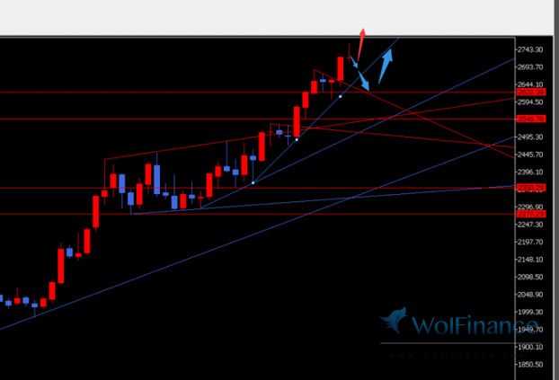 周线图,本周再次创新高,触及2760关口附近,出现较大回落,笔者认为本周或能收十字星,下周出现回调的概率较大,但目前加速上行的趋势还未破坏