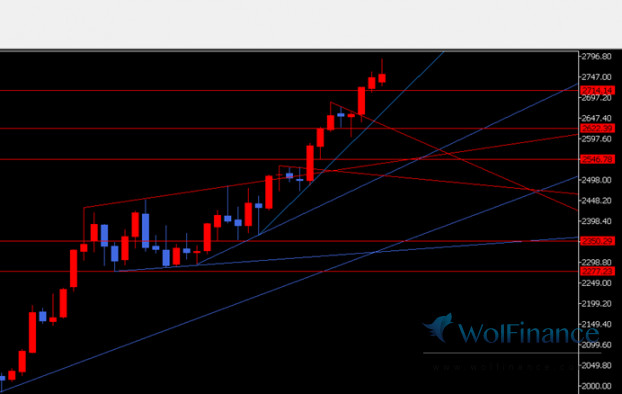周线图,本周再次创新高,触及2790关口附近,出现较大回落,笔者认为本周或能收小倒锤,下周出现回调的概率较大,但目前加速上行的趋势还未破坏,上方至于还有没空间,笔者认为短期小概率能到2800或上方,至少需要一段时间调整