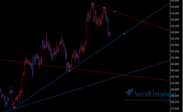 白银,如预料中出现了回调走势,不排除还会惯性再次下探试探低点,谨防跌破蓝色趋势线出现更大的回调,不过中长期依然看多头走势,若是做中长线的金友,不怕短线被套的,依然可以考虑30-32区间小仓入场布局多单