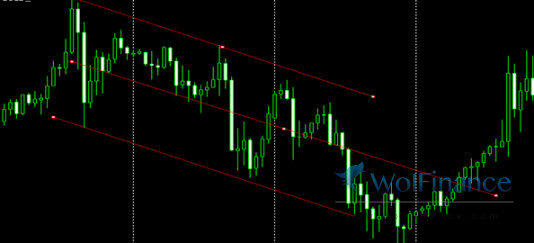 (2)下降等距平行线(下降通道):寻找可靠的阻力位置,至少依次下降的两个高点做为依据点,再寻找两高点间其中的至少一个低点支撑位,画出平行线,就以形成一个下降通道,如图所示: