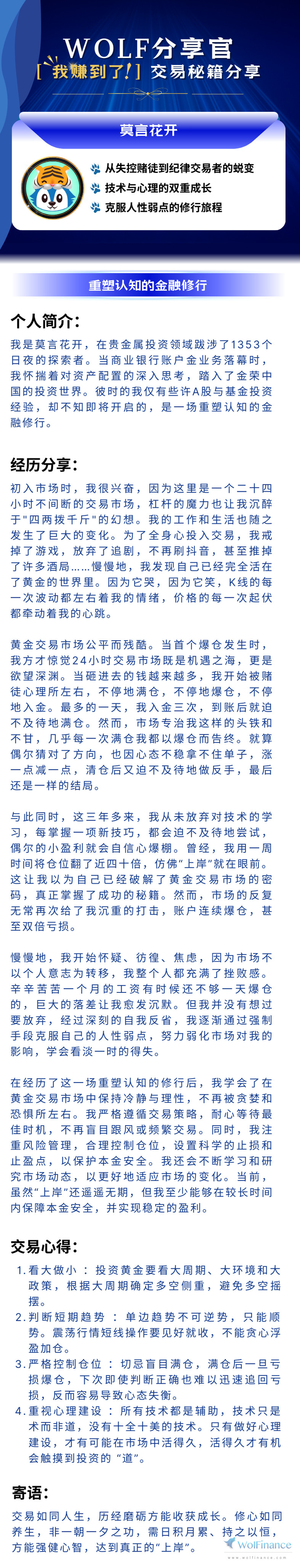 为了搭建一个交流的平台,让投资者们得以分享他们的成功故事、成长历程,以及在投资旅程中积累的宝贵经验和独到见解,我们特别推出了【WOLF分享官】专栏。在这个专栏中,我们不仅能够洞察不同投资者背后的心路历程,还能在彼此的故事中找到共鸣,学习经验,互相激励,携手成长。