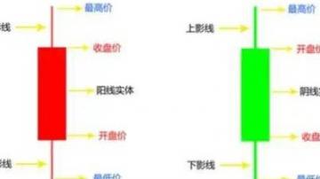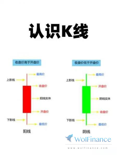 • 实体:表示开盘价与收盘价之间的范围。如果收盘价高于开盘价,则为阳线;如果收盘价低于开盘价,则为阴线。
