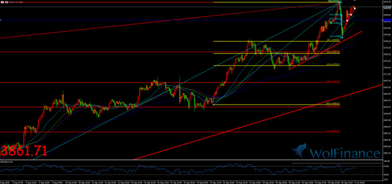 国际黄金周二(9月30日)触底反弹震荡收涨,开盘价3830.33美元/盎司,最高价3871.61美元/盎司,最低价3793.15美元/盎司,收盘价3839.10美元/盎司。