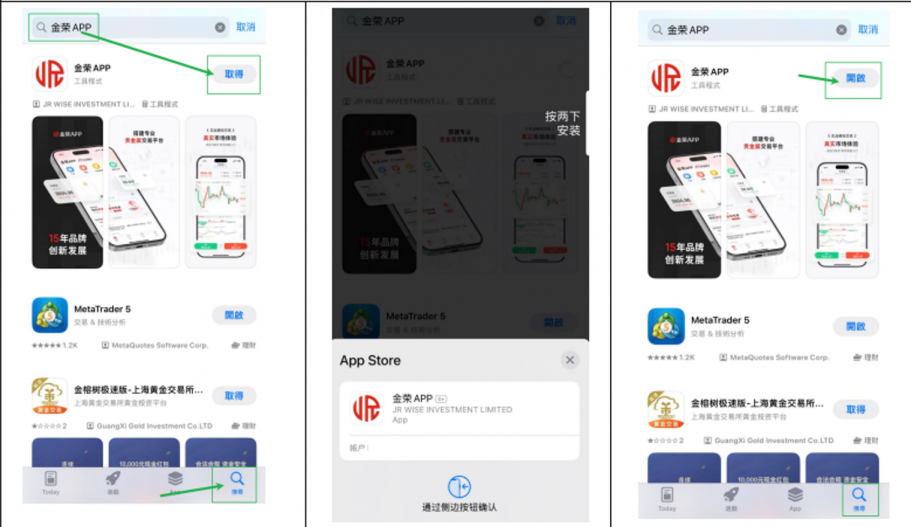 注意:如完成①②操作后,在APP Store里无法搜索到金荣APP,请在APP Store软件右上角里进入查看是否成功切换地区。并进行关机重启、退出ID账号重新登录方式来操作。则可成功搜索到金荣APP进行取得下载安装。
