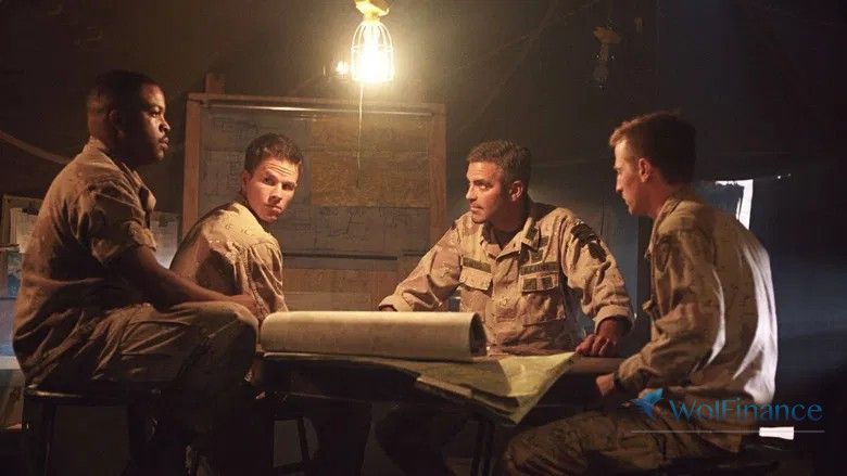 他们将地图拿给精通阿拉伯语的埃尔金中士(艾斯·库珀饰)翻译,证实这标示着萨达姆从科威特掠夺来的黄金埋藏地点——价值数以亿计的金条。正当三人密谋时,即将退役的特种部队少校阿奇·盖茨(乔治·克鲁尼饰)闯入,识破了他们的计划。这个玩世不恭的职业军人说了一句点题的话:"一个理智的人会追求三样东西:首先是金钱,第二还是金钱,第三,你猜对了,也是金钱。"于是,四人达成共识,开着悍马车踏上了寻宝之路。