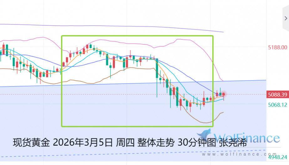 上交易日周四(3月5日):国际黄金遇阻回落收跌,收复周三涨幅,再度回踩中轨线等支撑位置,虽有一定的支撑买盘预期,但在突破5-10日短期均线上方持稳前,走势仍偏弱,下方留意昨日低点附近支撑,以及60日均线支撑附近选择做多位置。