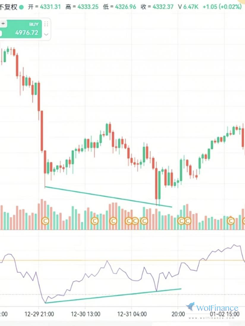 顶背离(看跌反转) 价格:高点越来越高 RSI:高点越来越低 上涨动能减弱,可能转跌 底背离(看涨反转) 价格:低点越来越低 RSI:低点越来越高 下跌动能减弱,可能转涨