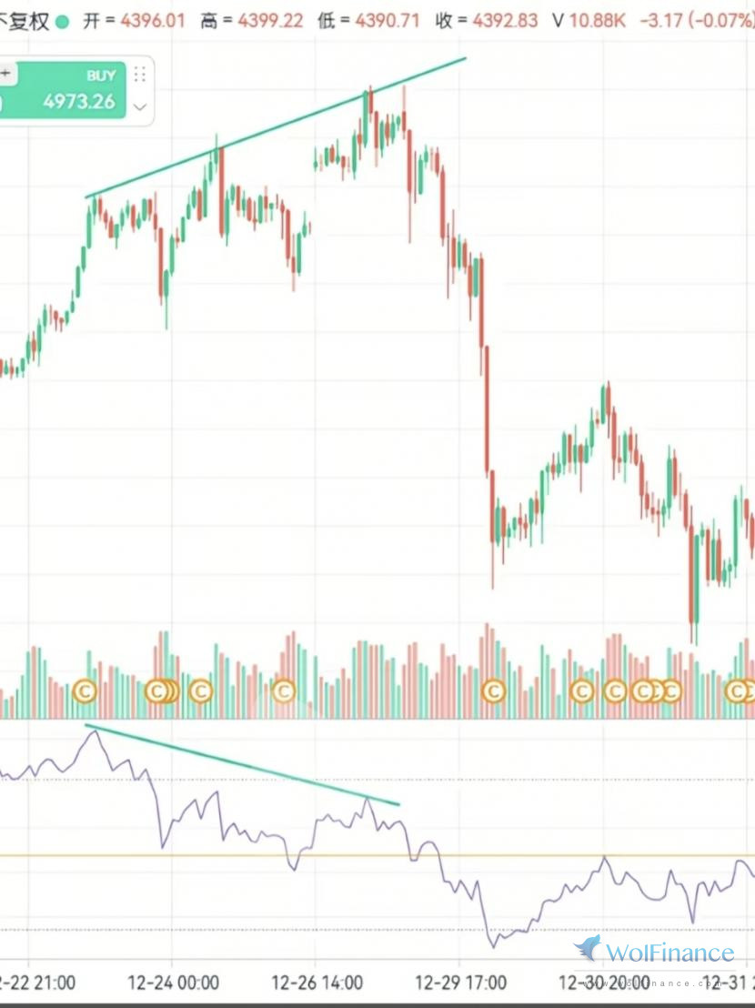 顶背离(看跌反转) 价格:高点越来越高 RSI:高点越来越低 上涨动能减弱,可能