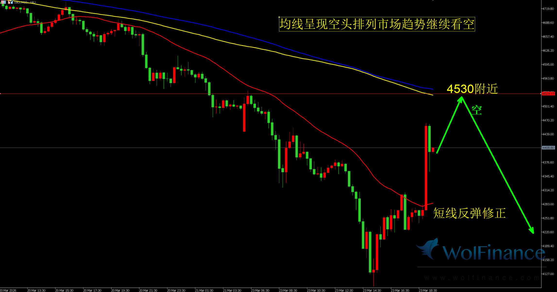 周一(03月23日)晚盘时段,现货黄金短线弱势运行,当前MT5报价4393美元/盎司,整体空头趋势主导盘面,暂无明显反转信号。基本面:上周美联储3月利率决议维持3.50%-3.75%基准利率不变,同时点阵图大幅下调2026年降息预期,全年降息次数缩减至1次甚至存在维持高利率不变的可能,鲍威尔后续讲话持续释放鹰派信号,明确表态通胀未达到调控目标绝不急于降息,意味着高利率环境将持续更久,直接提振美元指数与美债收益率维持高位运行,对无息黄金的持有价值形成持续性压制。