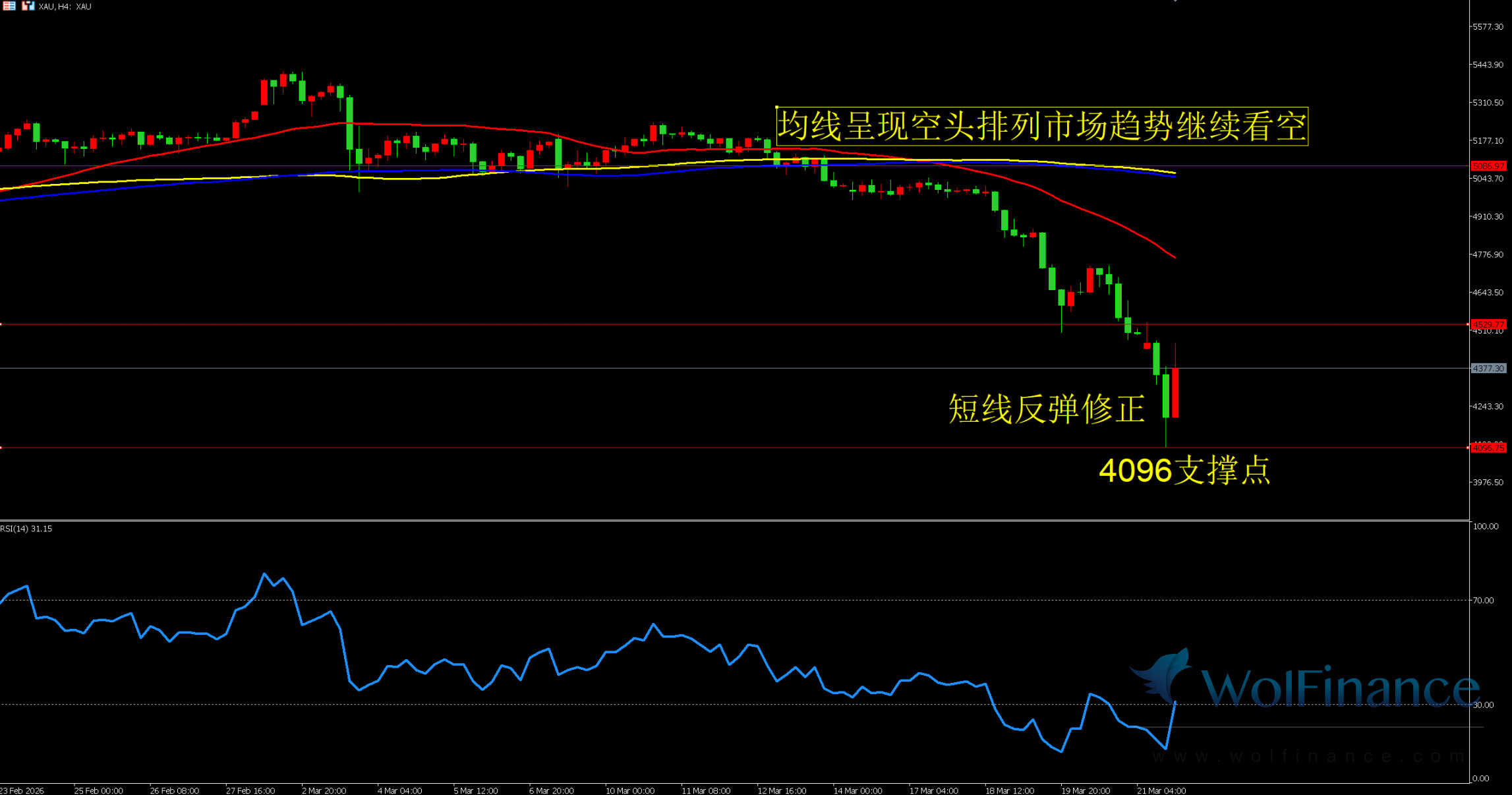 三均线入场信号判断:15分钟周期严格跟随4小时大周期空头方向,K线价格始终处于均线系统下方,均线维持空头排列态势,红色31均线对价格形成直接压制,金价反弹触及均线区域便会承压回落,无有效突破迹象。RSI指标辅助:15分钟RSI指标低位震荡运行,空头力量逐步释放,存在小幅技术性反弹概率,但整体走势依旧偏空,不具备趋势反转的条件,切勿盲目抄底做多,耐心等待反弹做空机会。