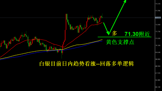 支撑位:71.30 美元 / 盎司(15 分钟黄色支撑点 + 做多核心区间),强支撑 70.80-71.00 美元 / 盎司(4 小时红色支撑位)