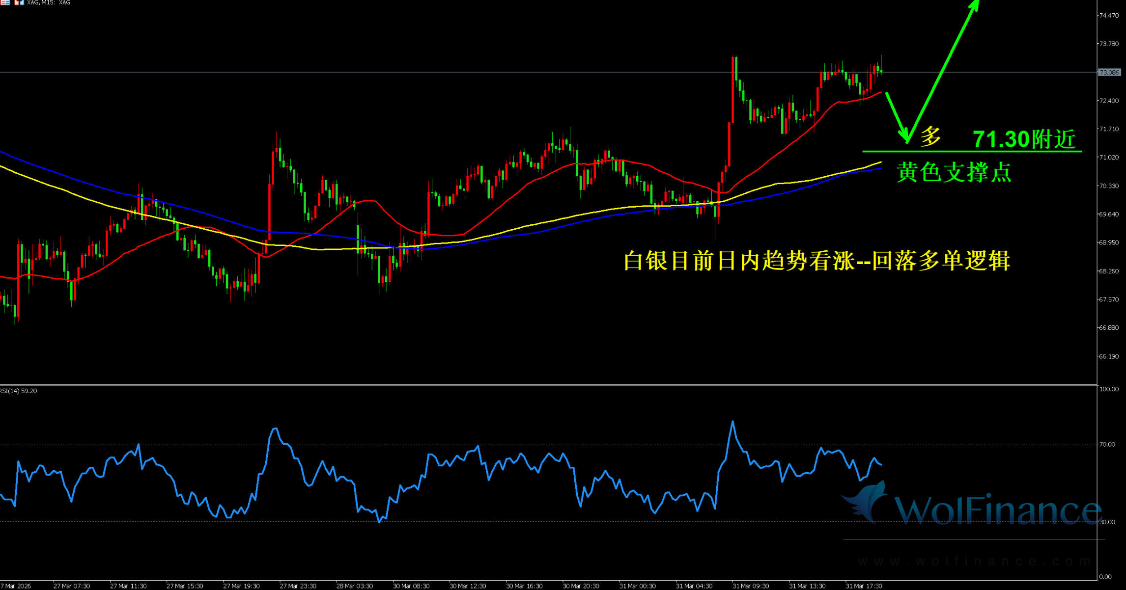 白银 K 线依托黄色支撑点 71.30 附近运行,图表标注 “白银目前日内趋势看涨 -- 回落多单逻辑”,红色 31 均线、黄色 144 均线、蓝色 165 均线呈现多头排列,价格回踩黄色支撑位不破则延续反弹节奏,上方触及前期高点阻力易出现震荡回落。15 分钟 RSI 指标报 59.20,处于 50 上方偏强区间,短线多头动能充足,虽有小幅回调需求,但未出现顶背离或超买信号,回调至支撑位即为做多良机,美盘以回落低多为核心操作思路,严禁追高。