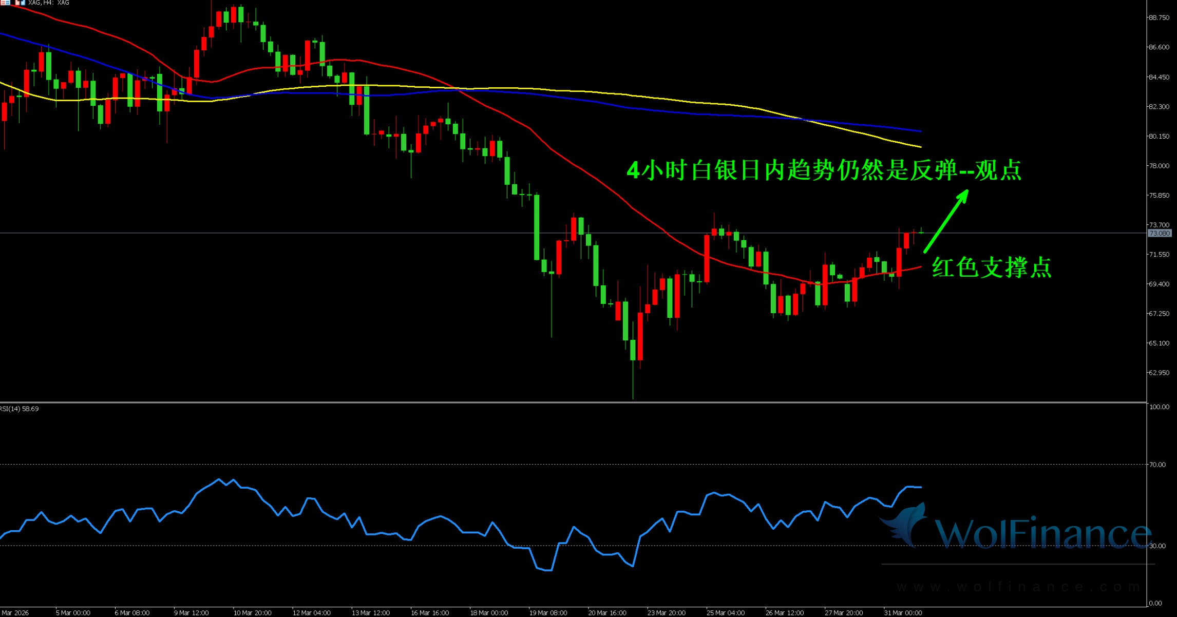 白银 K 线持续运行在红色 31 均线上方,红色支撑点拐头向上,构成短线反弹的核心生命线,图表明确标注 “4 小时白银日内趋势仍然是反弹”,确认当前为下跌后的技术性修复行情。黄色 144 均线与蓝色 165 均线仍处于下行通道,在上方构成中期强阻力,大周期空头结构未发生根本改变。4 小时 RSI 指标报 58.69,站稳 50 分水岭上方,处于多头动能区间,无明显超买信号,反弹动能仍有释放空间。