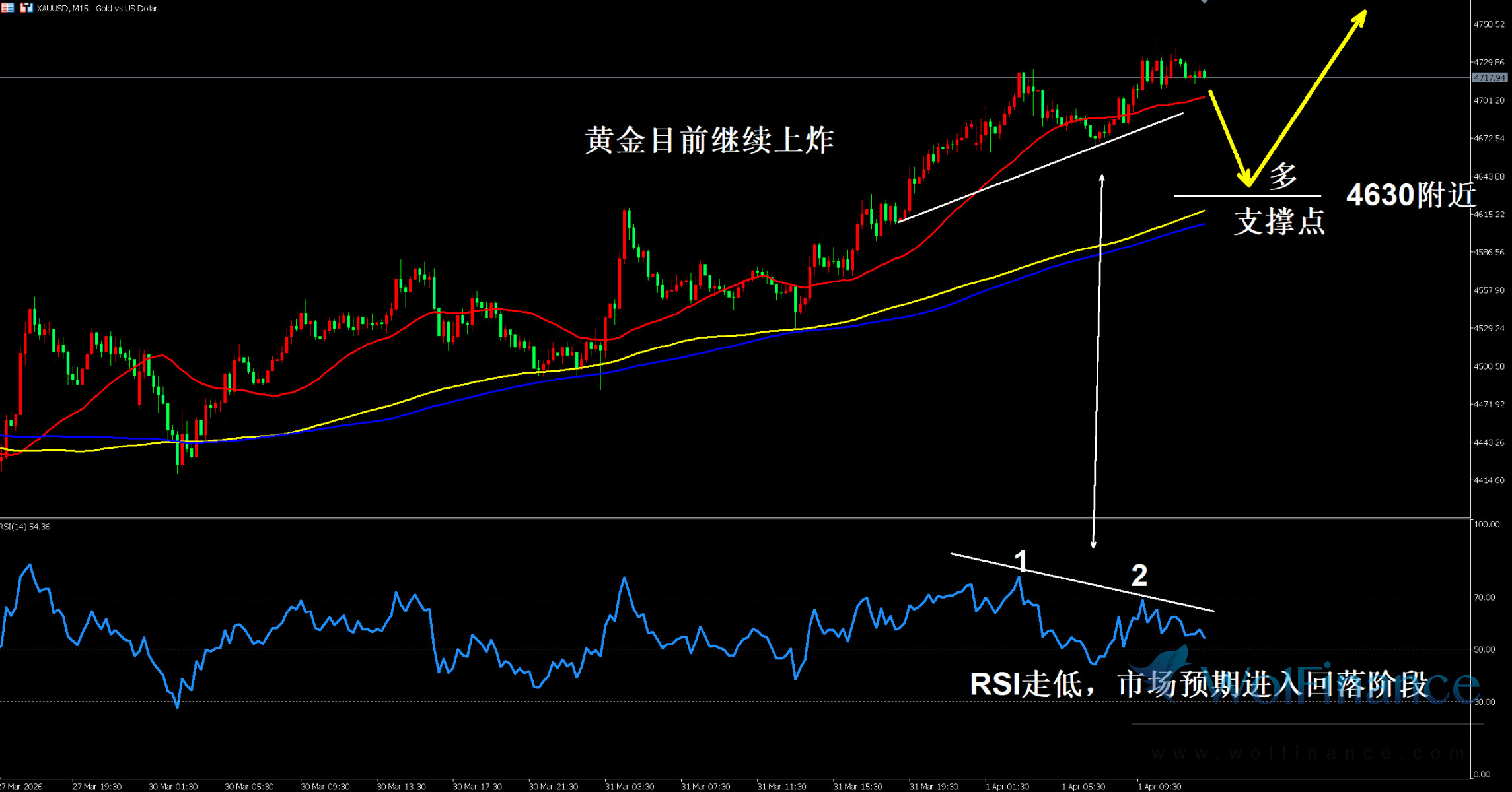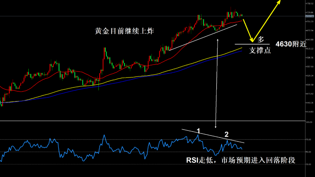 图表标注 “黄金目前继续上炸”,K 线依托上升通道运行,4630 附近为关键支撑点,均线呈多头排列。15 分钟 RSI 指标报 54.36,呈现走弱态势,图表标注 “RSI 走低,市场预期进入回落阶段”,虽短线仍偏强,但多头动能逐步衰减,美盘以回踩支撑低多为主,严禁追高,警惕冲高回落。