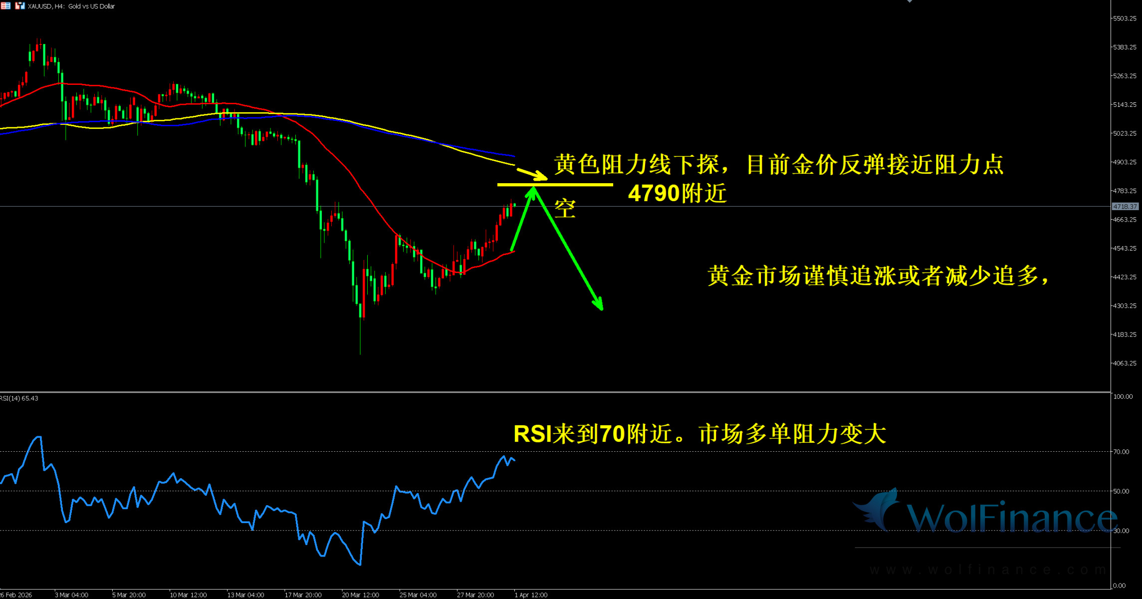 金价反弹接近黄色阻力线 4790 附近,图表标注 “黄色阻力线下探,目前金价反弹接近阻力点”,K 线运行于红色 31 均线上方,短线反弹结构明确,但黄色 144 均线与蓝色 165 均线仍在上方构成强阻力,大周期空头趋势未改,当前为超跌后的技术性反弹。4 小时 RSI 指标报 65.43,临近 70 超买阈值,多头动能接近饱和,多单阻力变大,需警惕回调风险。
