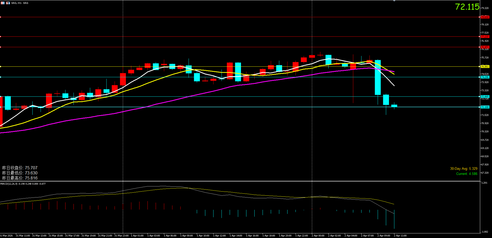 上方阻力:关注 73.00 - 73.50美元 区域。昨日白银在75美元附近受阻回落,显示上方抛压较重。若日内反弹无法站稳73.50美元,则可视为弱势反弹。