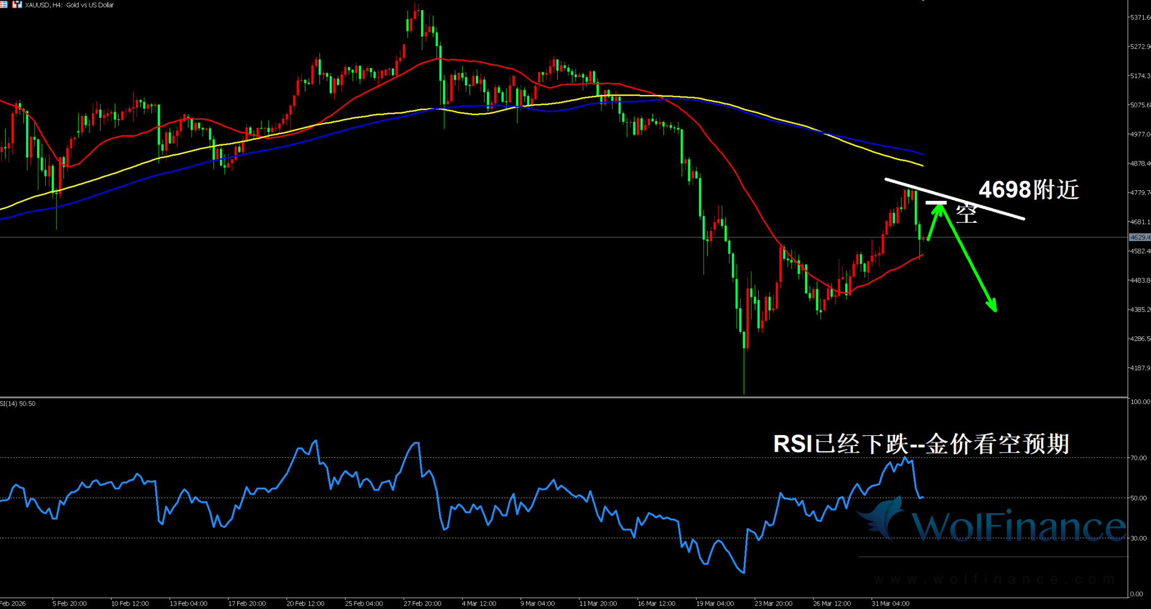 金价处于下跌趋势中的反弹阶段,K 线反弹至 4698 附近阻力位,图表标注该位置为空头入场区间,黄色 144 均线与蓝色 165 均线仍在上方构成强阻力,大周期空头趋势未改,当前为技术性反弹修复行情。4 小时 RSI 指标报 50.50,已出现下跌,金价看空预期增强,多头动能逐步衰减,需警惕反弹结束后的回落风险。