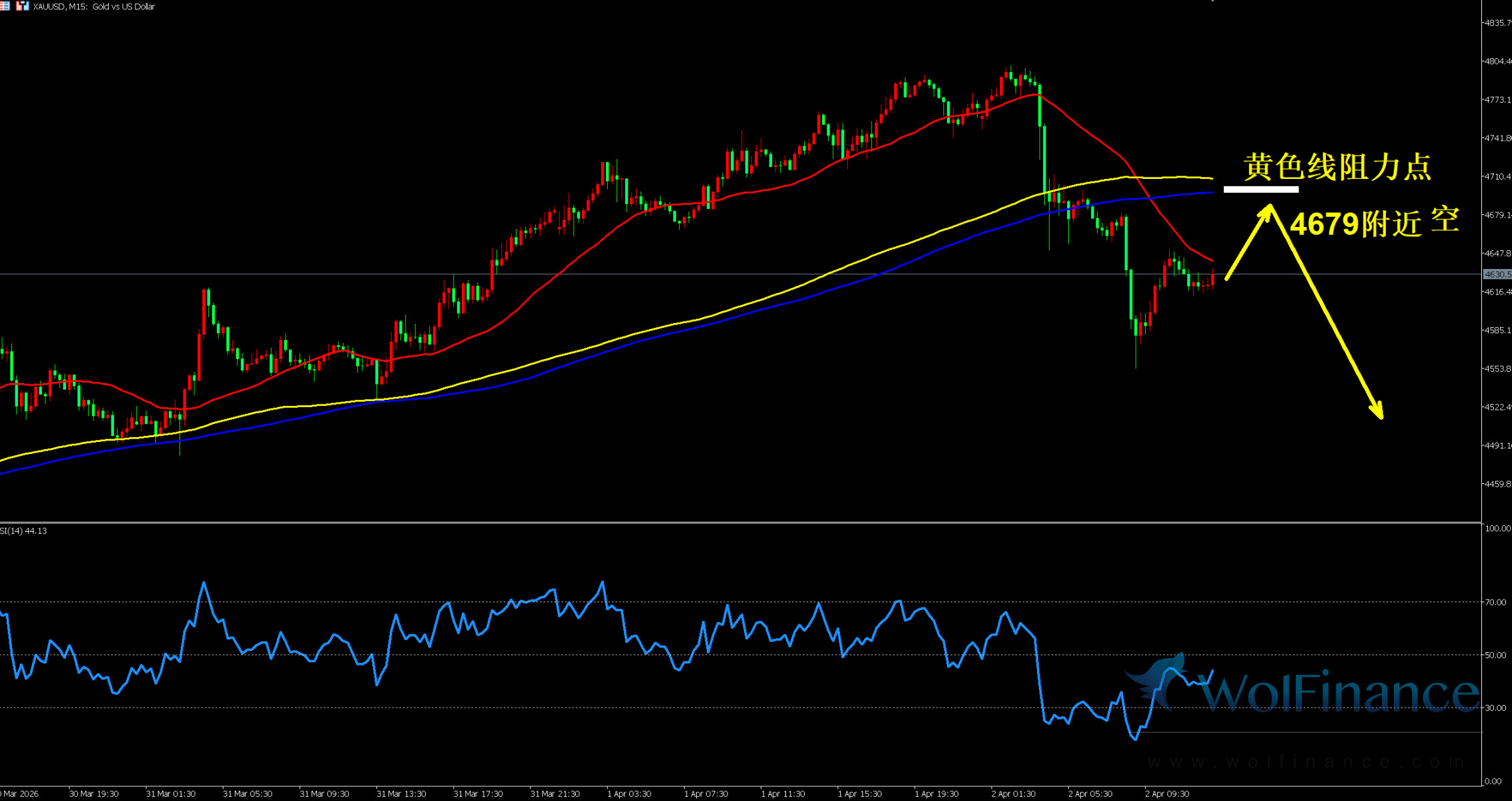 金价反弹至黄色线阻力点 4679 附近,图表标注该位置为空头入场区间,均线系统由多头排列转为走弱,价格反弹至阻力位后承压,短线反弹动能不足。15 分钟 RSI 指标报 44.13,处于 50 下方偏弱区间,空头力量逐步占据主导,美盘以反弹做空为核心思路,谨慎追多。