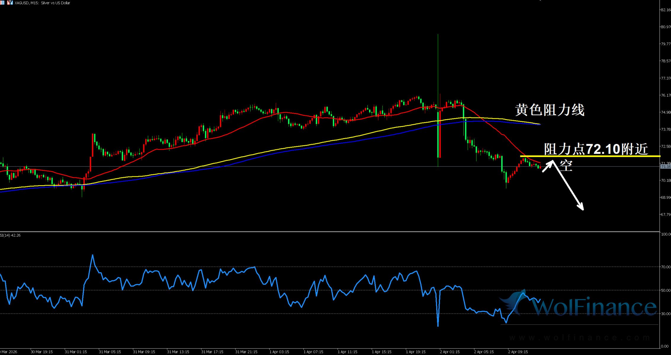 白银反弹至黄色阻力线 72.10 附近,图表标注该位置为空头入场区间,均线系统由多头排列转为走弱,价格反弹至阻力位后承压,短线反弹动能不足。15 分钟 RSI 指标报 42.26,处于 50 下方偏弱区间,空头力量进一步强化,美盘以反弹做空为核心思路,严禁追多。
