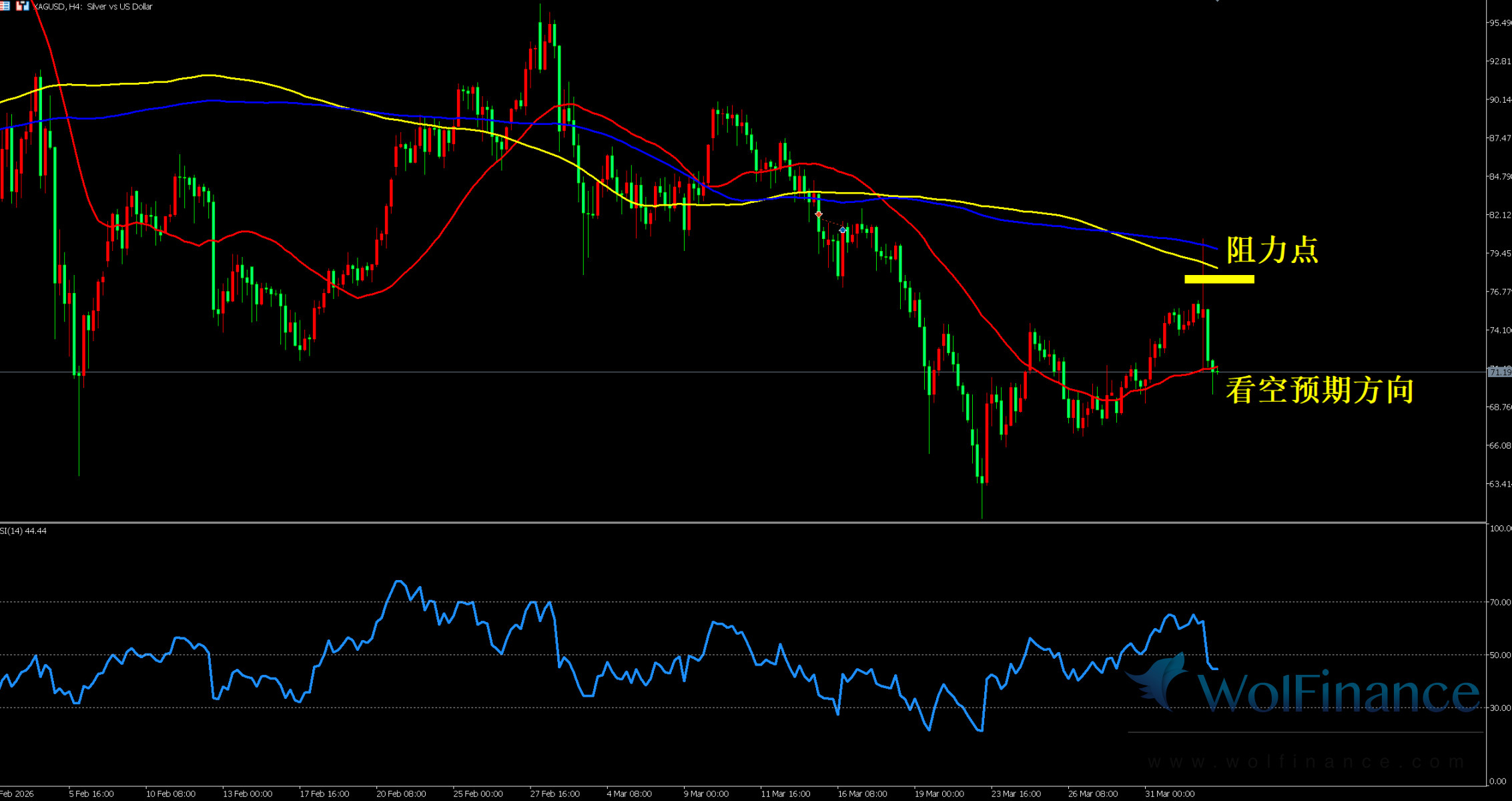 白银处于下降趋势中的弱势反弹阶段,图表标注明确看空预期方向,黄色 144 均线与蓝色 165 均线在上方构成强阻力,大周期空头趋势未改,当前仅为技术性超跌反弹。4 小时 RSI 指标报 44.44,处于 50 下方偏弱区间,空头力量占据主导,反弹动能持续衰减,需警惕反弹结束后的回落风险。