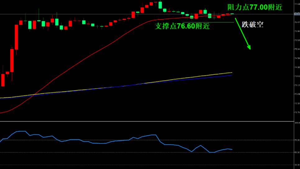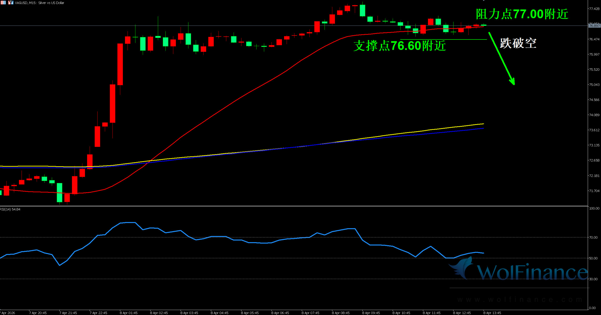 图表标注76.60 附近为关键支撑点,77.00 附近为核心阻力点,价格运行于阻力位下方,呈现高位震荡后承压态势。15 分钟 RSI 指标报 54.84,处于 50 上方但动能减弱,若跌破 76.60 支撑则将触发短线看空行情,美盘以阻力位做空、支撑位破位追空为核心思路。