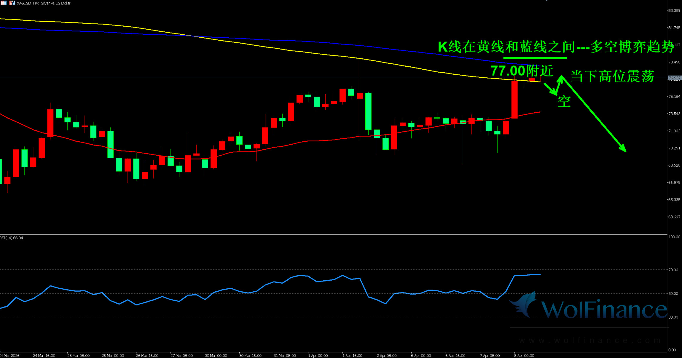 白银 K 线运行于黄色均线与蓝色均线之间,图表明确标注为多空博弈趋势,当前处于77.00 附近高位震荡,大周期缺乏明确趋势方向,多空力量处于均衡状态。4 小时 RSI 指标报 66.04,处于偏强区间但已出现拐头向下信号,多头动能逐步衰减,需警惕高位破位后的下跌风险。