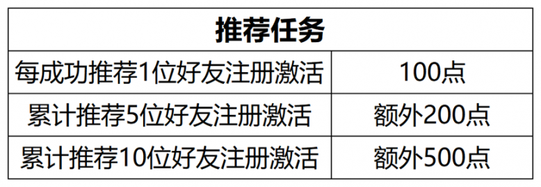 3. 推荐任务:好友通过您的专属推荐链接注册激活。
