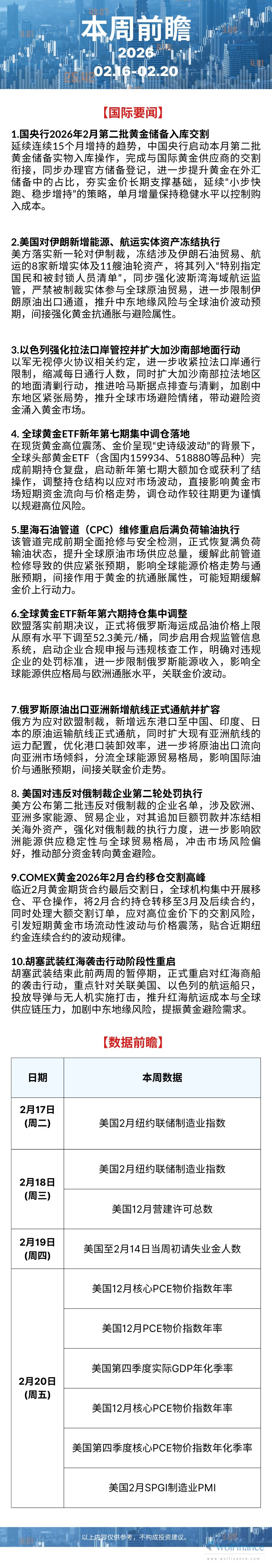 【本周前瞻】2月16日-20日金市焦点前瞻