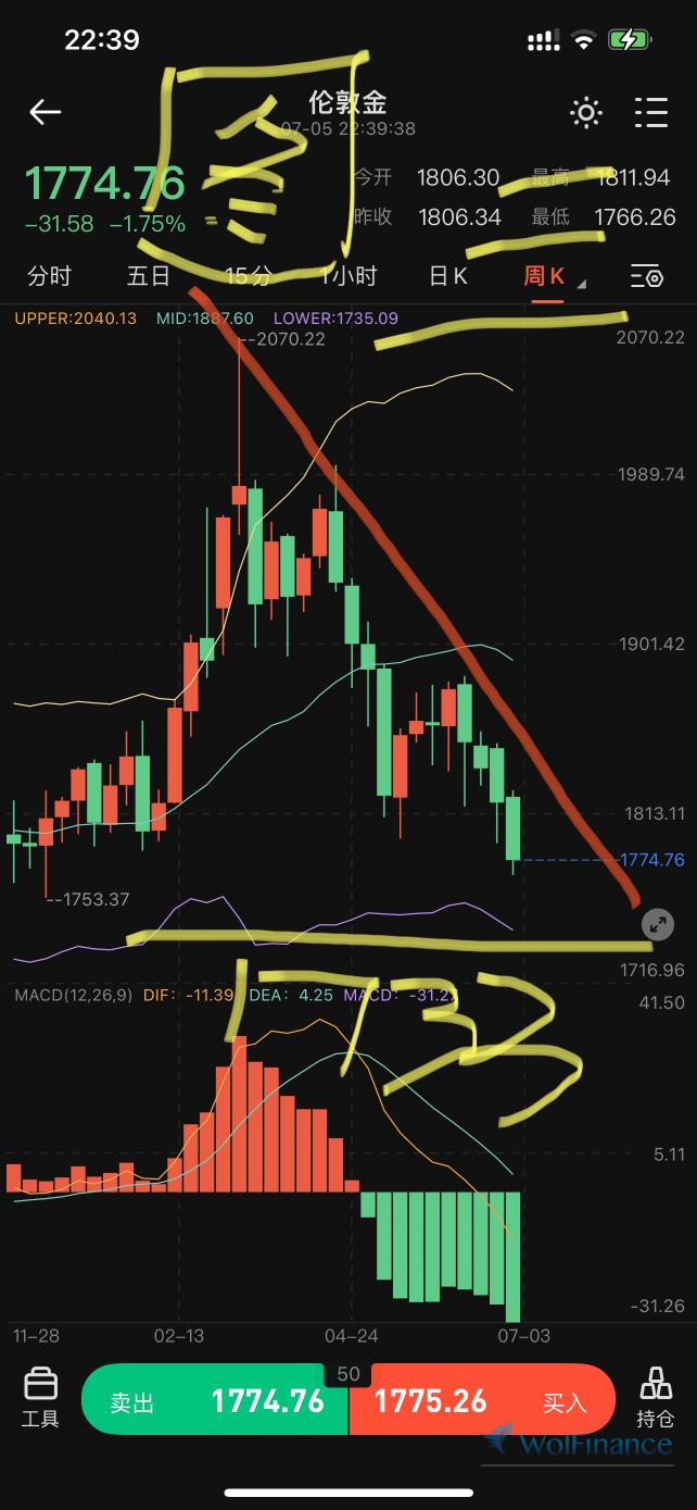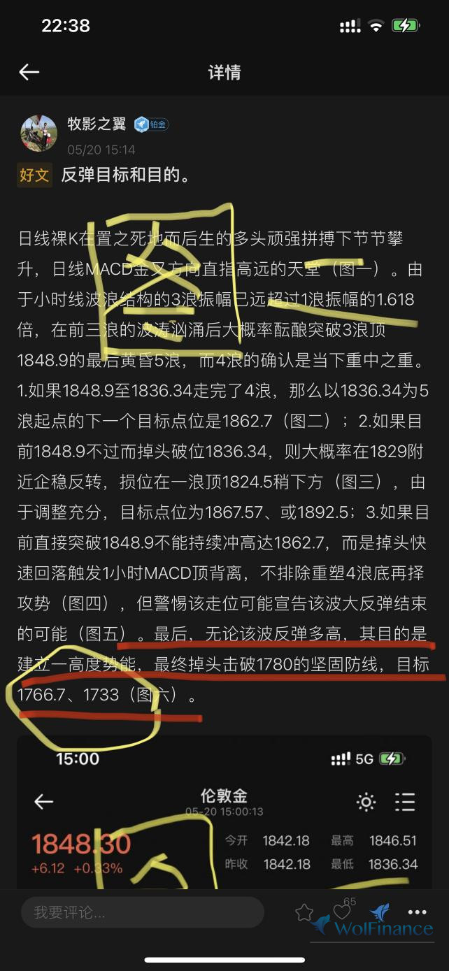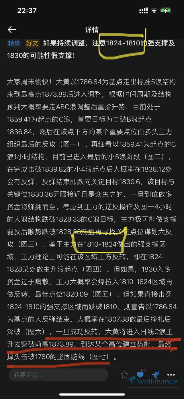 上帖,大黄从1873.89的高处向下调整,我给出了1824-1810的强支撑区域(图一黄圈),实盘,大黄直接打到该期间上方1824.89误差0.89美元,随后展开大反弹突破前高1873.89来到最高1878.89。我在上帖强调,无论涨幅多高目的是建立高度势能最终跌破1780的坚固防线(图一红线)。今晚,主力最终实现了预判直接击穿1780。我在前贴两贴给过1780下方的两个关键支撑点1766.7及1733(图二),今晚刚刚的最低点为1766.26,误差1766.7为0.44美元。目前的反弹并不代表该点1766.26必定支撑形成大反转,在周五的狂风暴雨来临前,注意下方第二道支撑1733及上方的下降趋势线压制(图三)!
