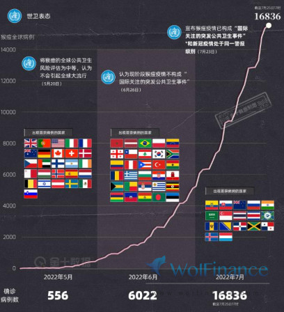 今年5月初,英国出现首例猴痘确诊病例,随后疫情在全球多地快速蔓延,短短三个月左右,已有70多个国家相继报道出现猴痘病例,截至目前全球累计确诊1.6万多例。世卫组织的表态也从 5 月份的“将猴痘的全球公共卫生风险评估为中等,认为不会引起全球大流行”转变成“猴痘疫情已构成‘国际关注的突发公共卫生事件’”,将猴痘疫情与新冠疫情划分为同一警报级别。